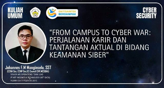 Kedatangan Johannes Manginsela yang merupakan jebolan Program Studi D4 Teknik Informatika tahun 2015 tersebut, untuk memberikan kuliah umum secara daring bertajuk “From Campus to Cyber War: Perjalanan Karir di Keamanan Siber”, sekalius berbagi inspirasi bagi para mahasiswa Prodi Teknik Informatika.