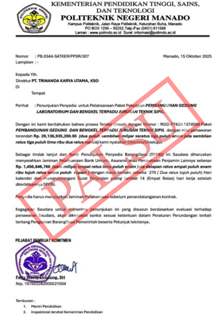 CYBERSULUT.NET – Politeknik Negeri Manado (Polimdo) memberikan klarifikasi resmi terkait beredarnya Surat Penunjukan Penyedia Barang/Jasa (SPPBJ) Pekerjaan Pembangunan Gedung Laboratorium dan Bengkel Terpadu Jurusan Teknik Sipil Nomor : PB.-0344-SATKER/PPSR/307.