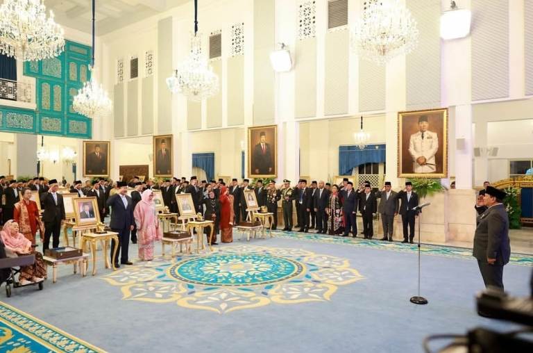 Lencana tanda jasa diserahkan langsung Presiden Prabowo kepada ahli waris pahlawan nasional di Istana Negara, Jakarta.