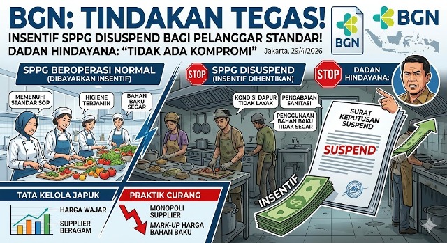 “Selama statusnya suspend karena kelalaian atau tidak terpenuhinya standar, insentif tidak dibayarkan. Insentif hanya diberikan kepada SPPG yang beroperasi normal dan memenuhi seluruh ketentuan,” ujar Dadan Hindayana di Jakarta, Rabu (29/4/2026).
